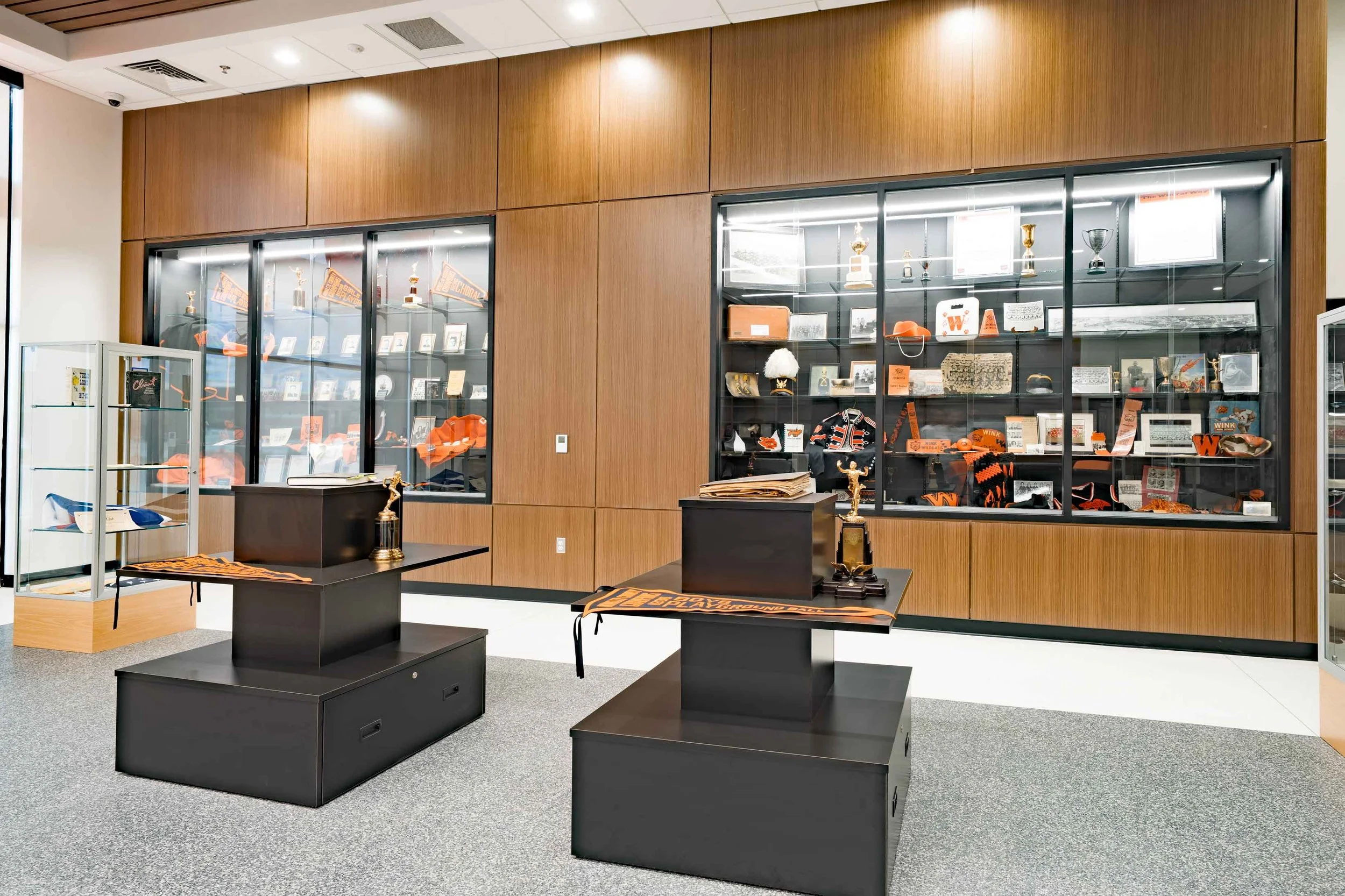 The Alumni Center stands as the most distinctive architectural design on campus, seamlessly blending the past and present. The main entrances on the north and south sides pay homage to history, meticulously replicating the façade of the original high school built in 1929. Beyond these iconic entry points, the building transitions into a contemporary design that mirrors the aesthetic of the Administration Building, featuring brick and cast stone complemented by metal canopies over expansive openings. The double-height entries lead into a grand lobby, which serves as the central hub of the building. This space guides visitors to the museum on the east side and the banquet hall on the west.