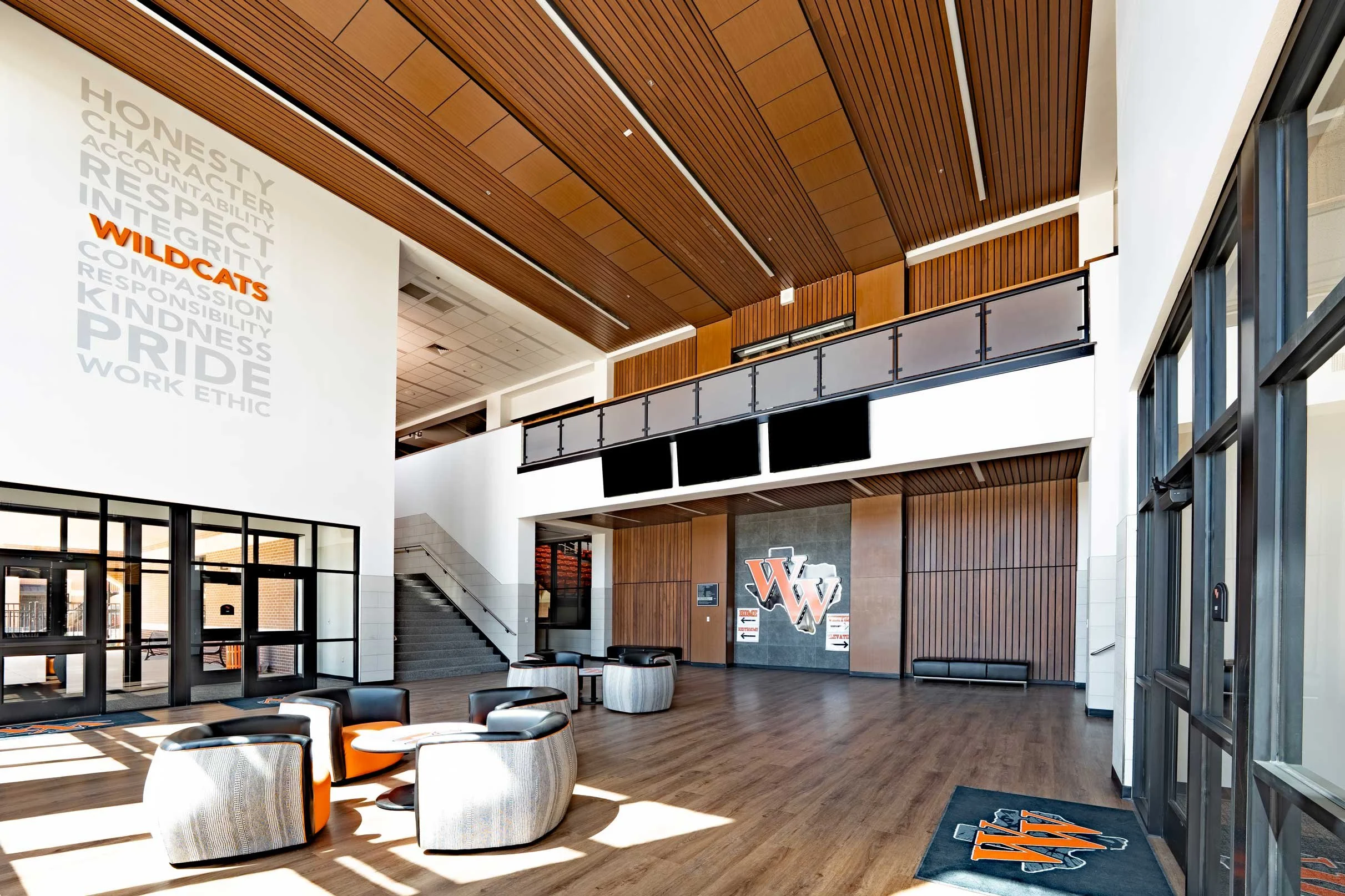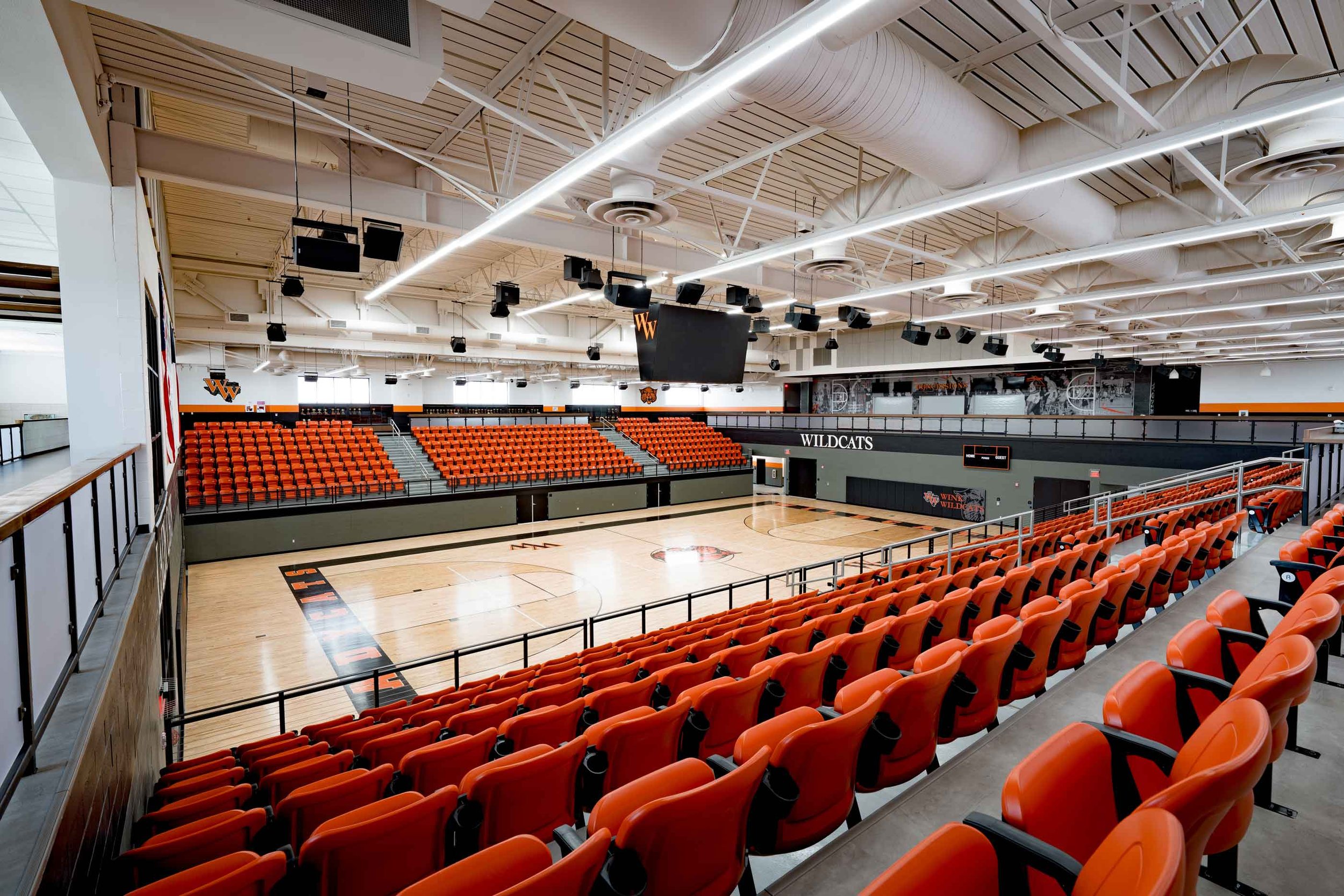 Upon entering the double-height lobby, visitors are greeted by warm wood-look finishes and two grand staircases that lead to the concourse level on the second floor, where seating and concessions are conveniently accessible. Below the grandstands, the layout is thoughtfully organized: the locker and dressing rooms for boys and girls are situated on the east and west sides of the court, while the centrally located coach’s office ensures efficient access and communication. This seamless integration of style and function creates an inviting yet secure athletic venue.