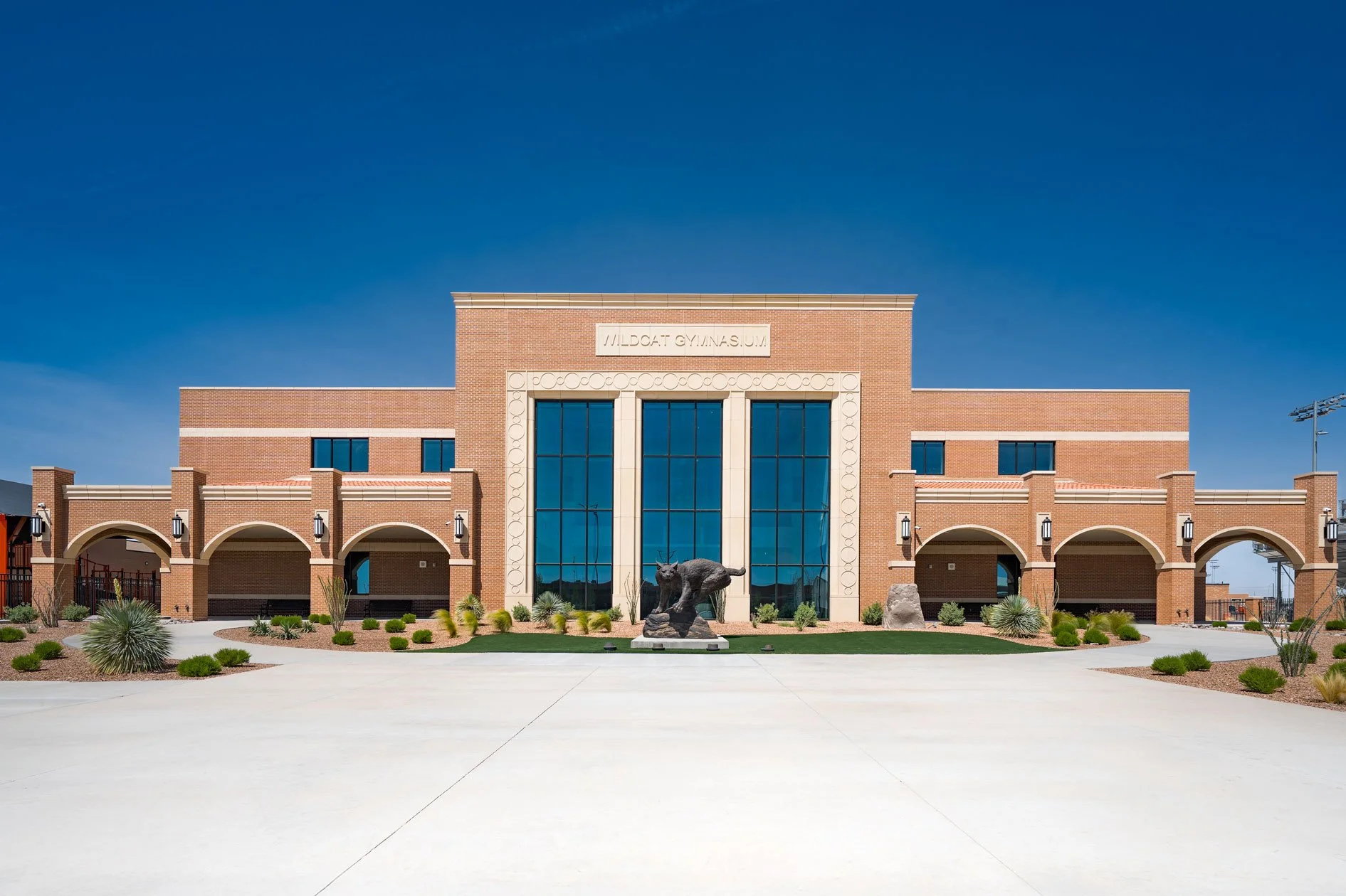 The Wildcats Gymnasium is an 800-seat basketball and volleyball arena located at the heart of the campus. Its south elevation showcases a striking central mass flanked by elegant archways, embodying the Mission Revival architectural style. Entrances are intentionally positioned on the side elevations to preserve the façade’s vertical prominence and monumental character.