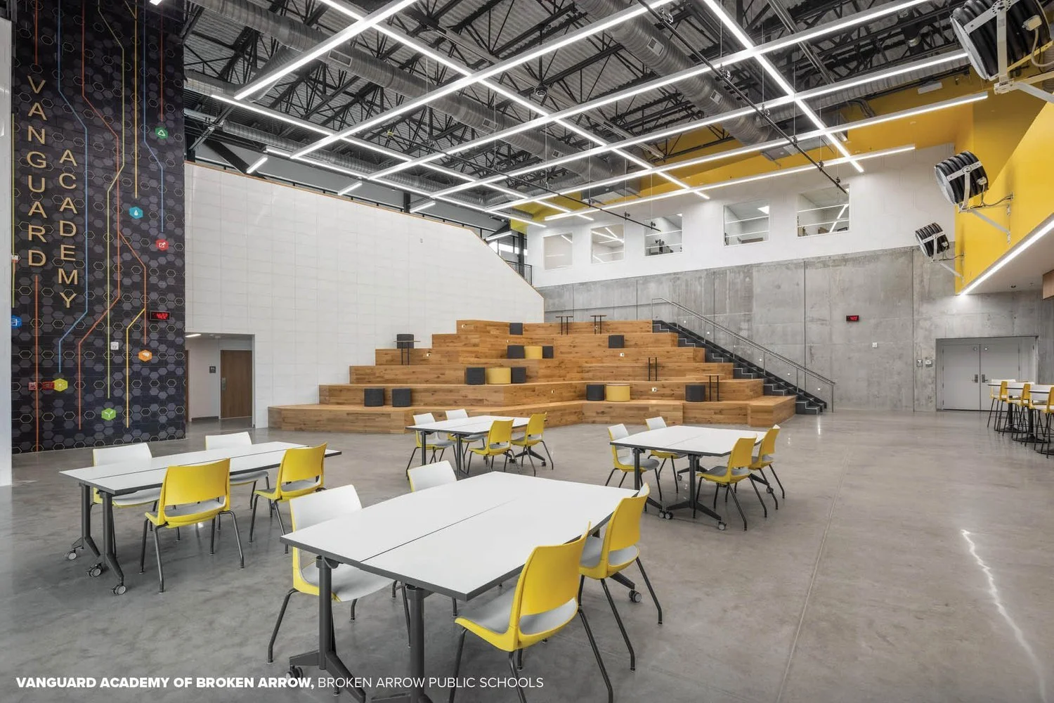 These spaces come in various forms, each serving a unique purpose in enhancing student learning experiences. Community High School and Broken Arrow’s Vanguard Academy offer staircases that double as seating allowing for a more informal environment where students are encouraged to stop and chat. Blue Ridge Elementary and Vanguard High School were designed with flexible, multi-use spaces where intimate conversations can happen.